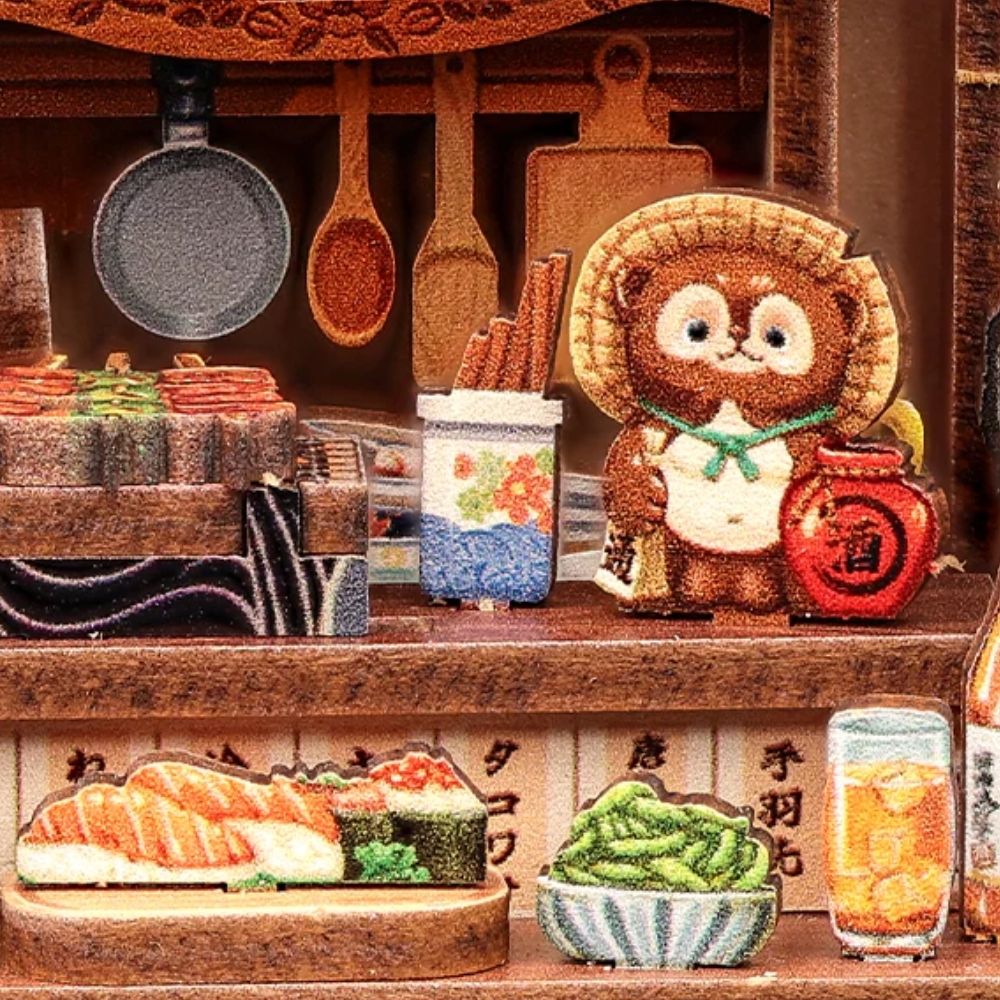 Altstadtviertel von Choshi fängt den gemütlichen Geist eines traditionellen japanischen Viertels bei Nacht ein. Papierlaternen wiegen sich sanft und werfen ein warmes Licht auf den Holztresen, der mit frischen Spießen und Sake-Flaschen gefüllt ist. Jedes Detail, die Spieße, die Laternen, die winzigen Sake-Becher, wecken den beruhigenden Duft, sanftes Lachen und die einfachen Freuden des Alltags. Dieses Miniaturdiorama bringt den Charme und die Wärme einer echten Izakaya direkt ins Regal.
