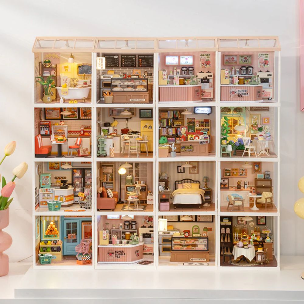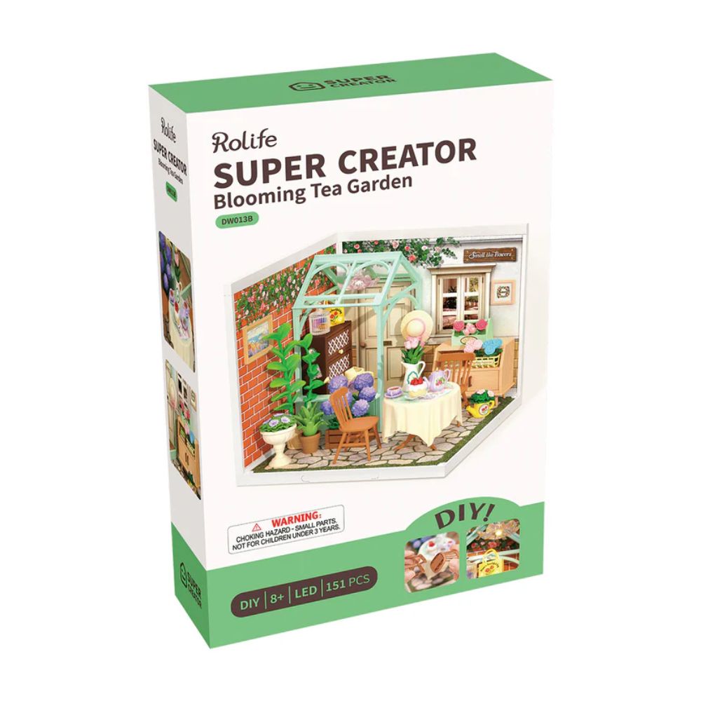 Genießen Sie die ruhige Atmosphäre eines blühenden Teegartens mit diesem Miniaturhaus-Kit. Dieses Modell ermöglicht es Ihnen, einen Raum zu erschaffen, in dem Sie eine Tasse Tee inmitten von Blumen genießen können. Das Innere ist mit Elementen wie einem Teetisch, Stühlen, Blumenarrangements, grünen Pflanzen und LED-Beleuchtung ausgestattet, die eine entspannende Atmosphäre schaffen.