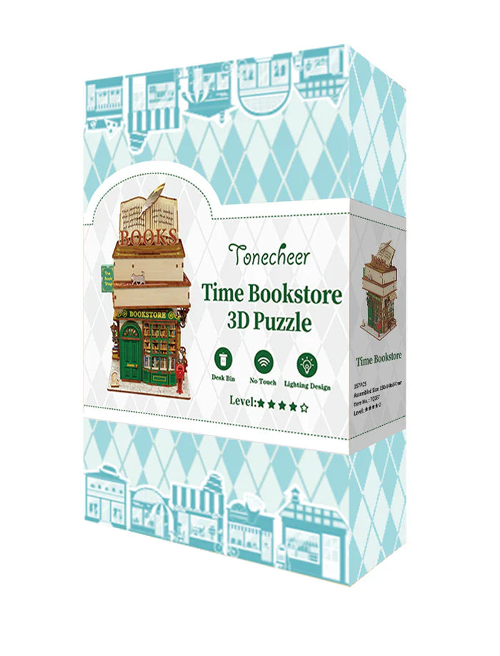 Erwecken Sie eine ruhige Ecke voller literarischer Nostalgie mit diesem Miniaturhaus-Kit zum Leben. Die Zeitbuchhandlung ist eine romantische und nostalgische Szene, die eine charmante Buchhandlung darstellt, komplett mit ihren Miniaturregalen, Schildern und einladenden Schaufenstern. Eine Katze auf dem roten Briefkasten fügt eine warme Note hinzu, während winzige Book Nooks Tonecheer durch das Schaufenster die Geschichte vervollständigen.