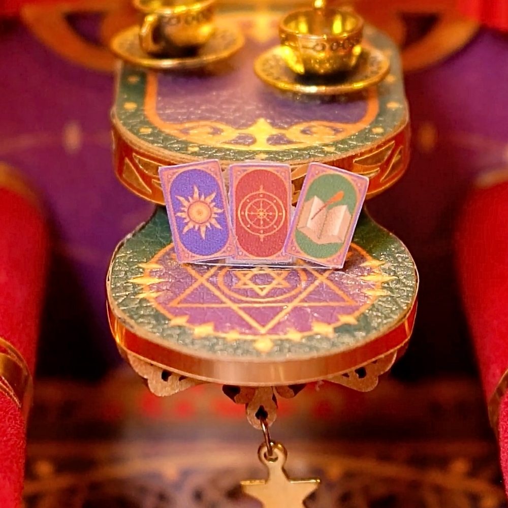 Dieses Book Nook stellt das Innere eines Waggons mit magischem Charme dar und fängt die Details einer verzauberten Reise ein. Gepolsterte Sitze und rote Fenstervorhänge rahmen ein gemütliches Abteil ein, während ein kleiner Tisch zwischen den Sitzen ein verstreutes Kartenspiel trägt, das auf Zauber, Spiele oder noch unentdeckte Schicksale hindeutet. Fein eingearbeitete, magische Details lassen erahnen, dass der Passagier kein gewöhnlicher Reisender ist, und eine neugierige Frage bleibt in der Luft: Wohin führt die Reise dieses geheimnisvollen Magiers, und welches Abenteuer erwartet ihn am Ende der Fahrt?