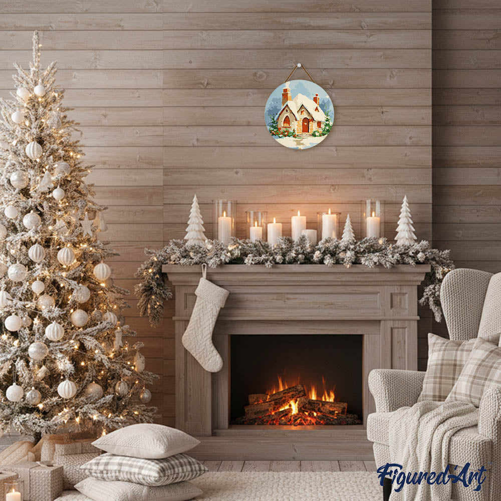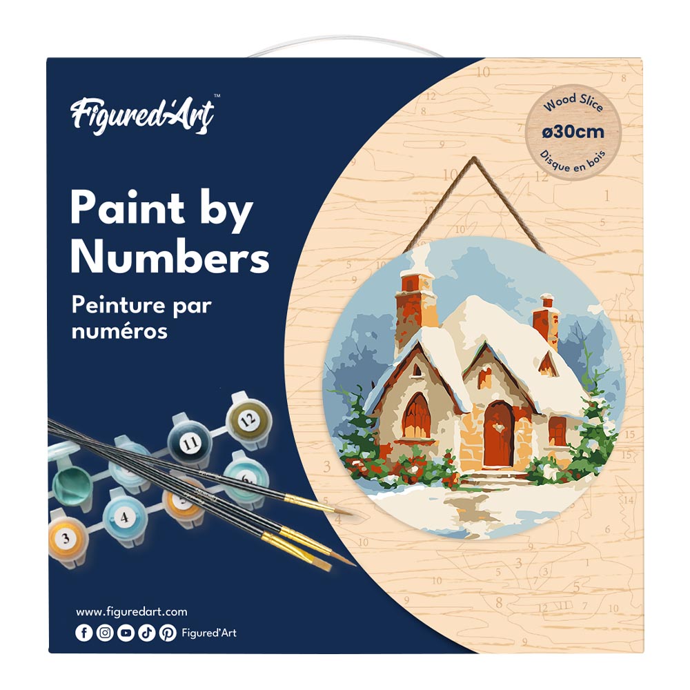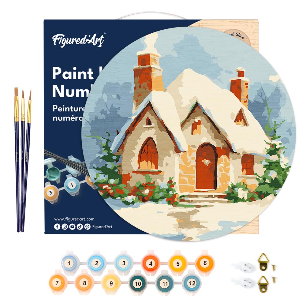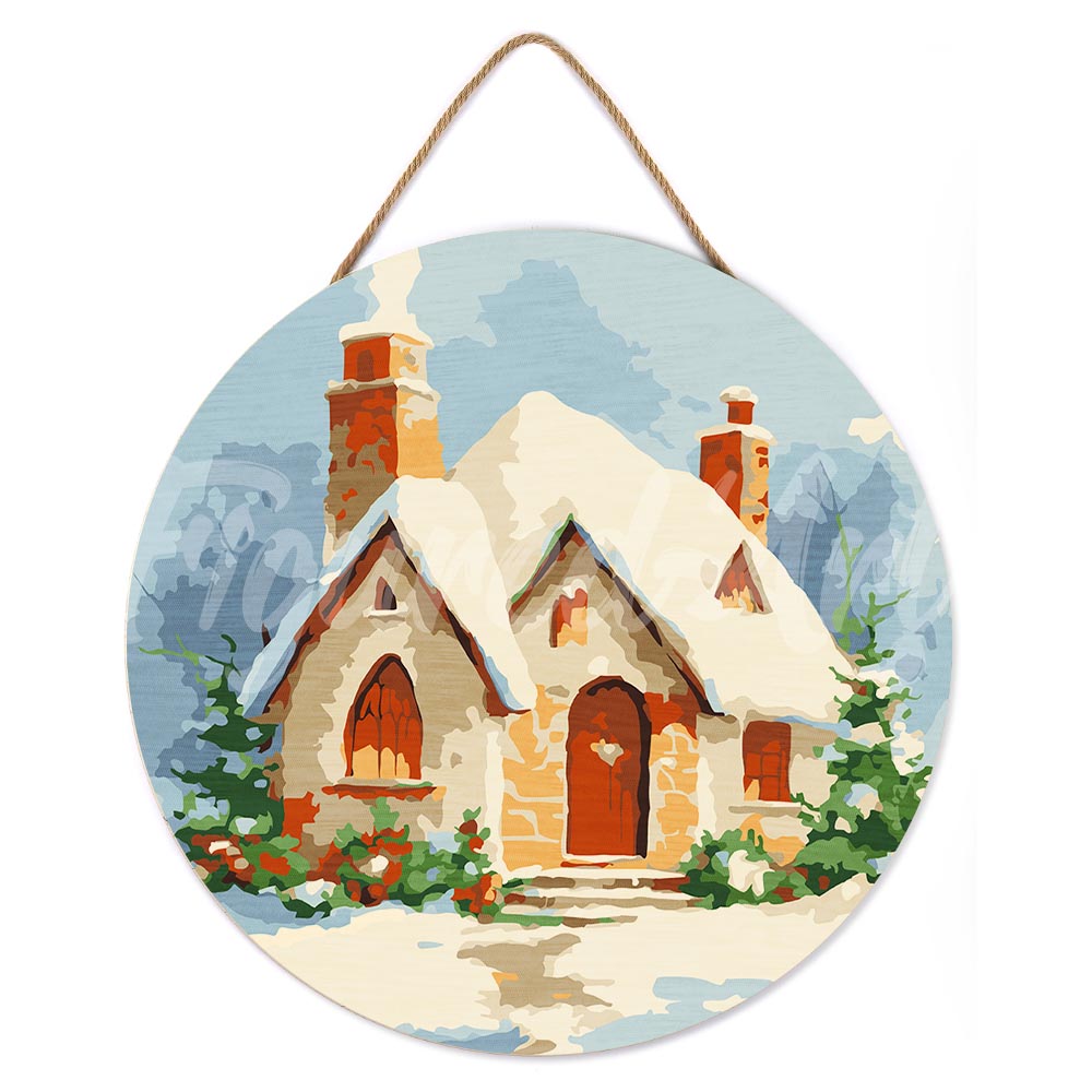 Malen nach Zahlen auf Holzscheibe - Backsteinhaus im Winter