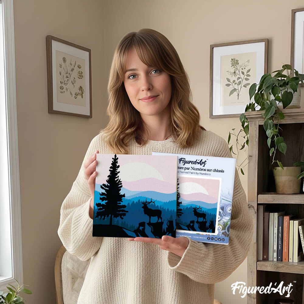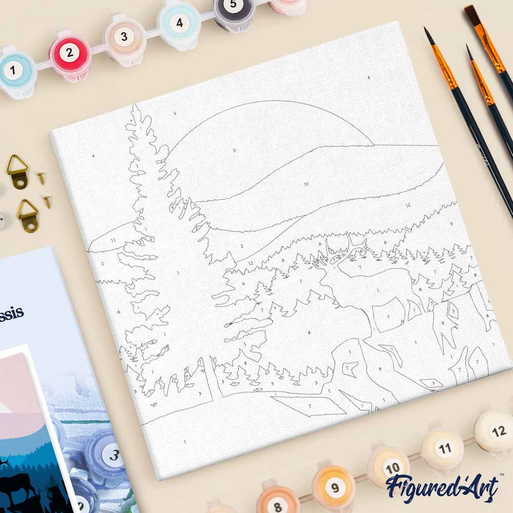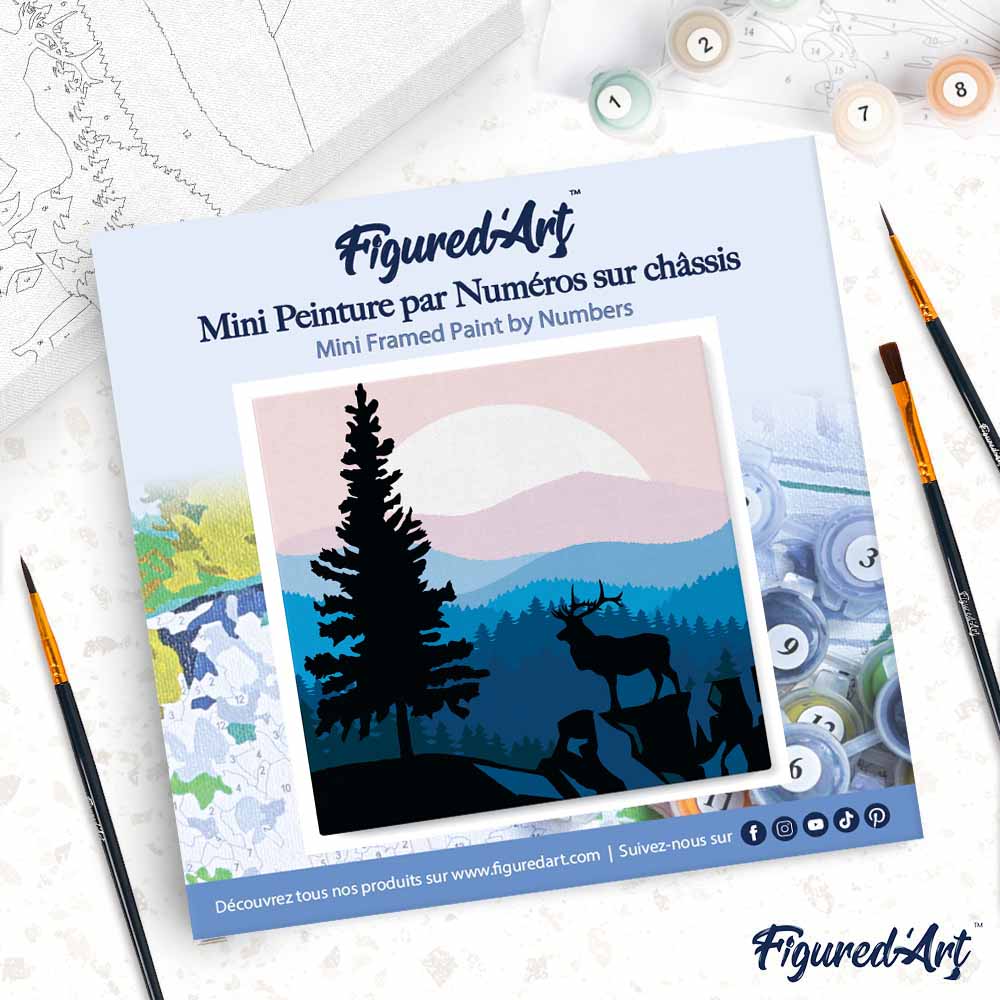 Mini Malen nach Zahlen mit Rahmen 20x20cm - Majestätischer Hirsch und Landschaft
