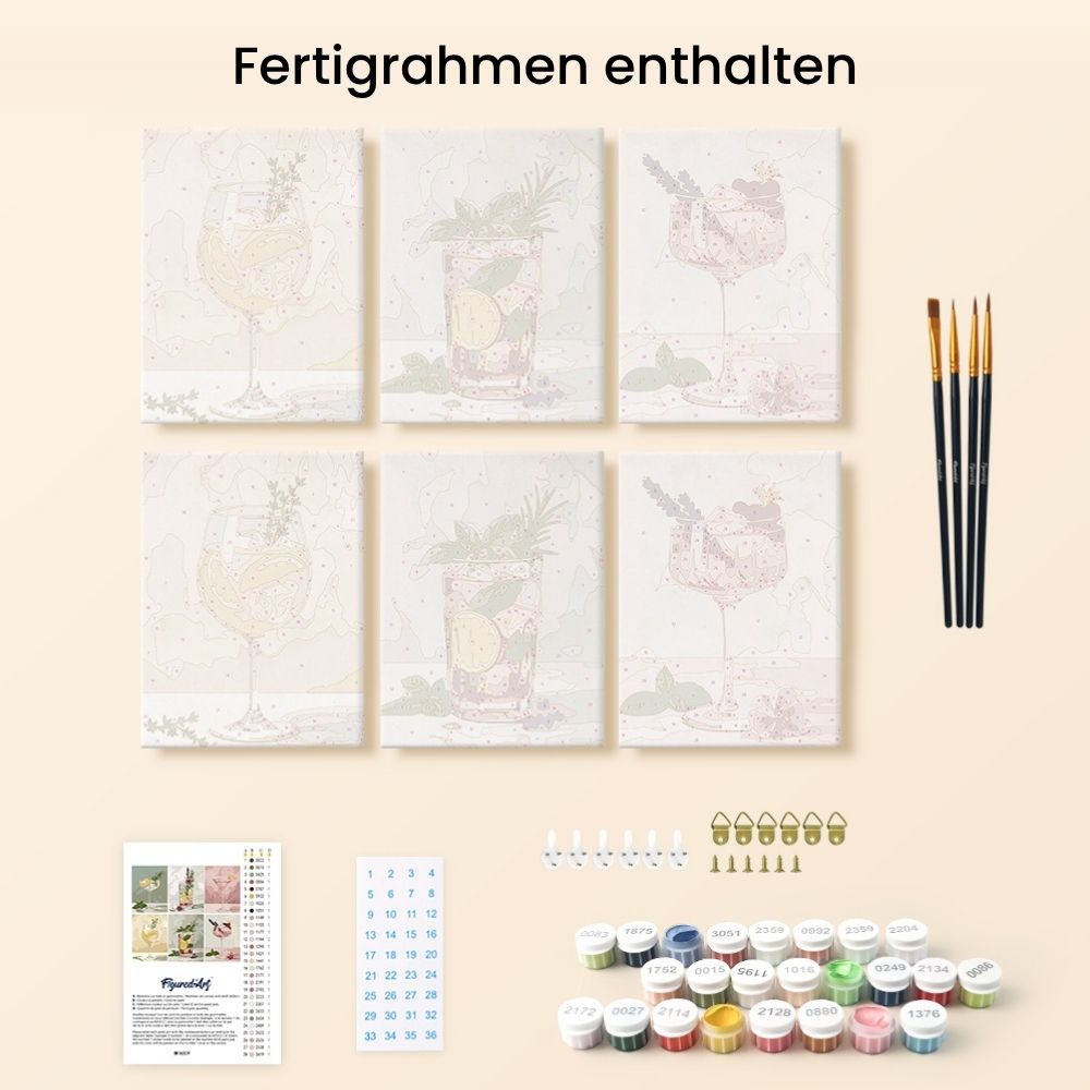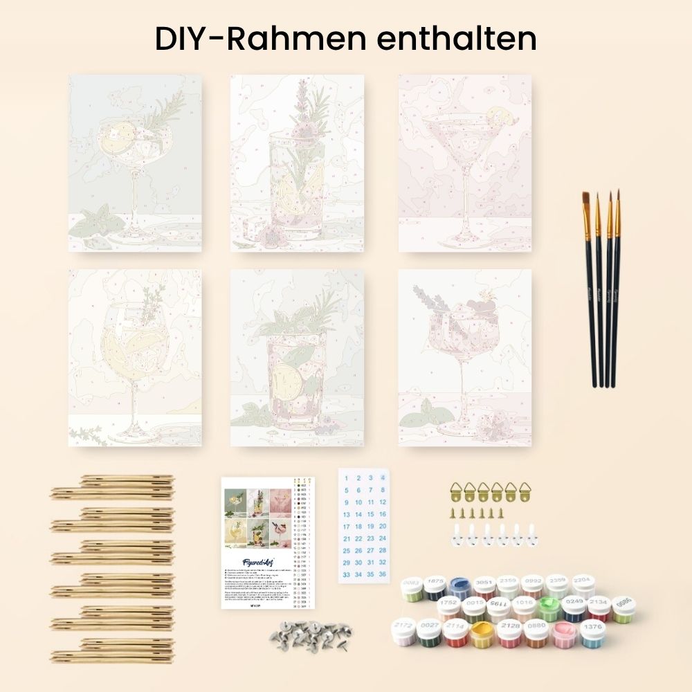 Das Set Botanisches Elixier enthält sechs farbenfrohe Malen nach Zahlen für Erwachsene-Modelle, inspiriert von der Welt der Cocktails. Von klassischen Martinis bis hin zu tropischen, bunten Drinks und eleganten Garnierungen, jede Leinwand vermittelt eine festliche, stilvolle Atmosphäre. Ideal, um Gäste zu beeindrucken oder deinem Zuhause einen Hauch von Raffinesse zu verleihen.