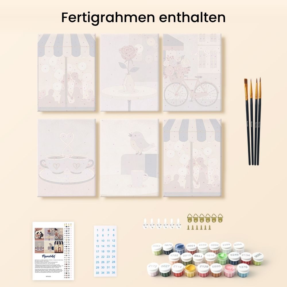 Das Set Café Romanze enthält sechs Malen nach Zahlen für Erwachsene-Modelle welche die Essenz eines romantischen Stadtbesuchs einfangen. Sanfte gemeinsame Szenen in Cafés, geflüsterte Liebesworte, rote Rosen und Fahrradtouren verbinden sich zu einer zarten, verträumten Farbpalette. Jede Leinwand vermittelt Zuneigung und Verbundenheit und verwandelt einfache Momente in zeitlose Ausdrucksformen von Liebe. Ein Malkit ideal für romantische Seelen und Liebhaber feiner Kunst zugleich.