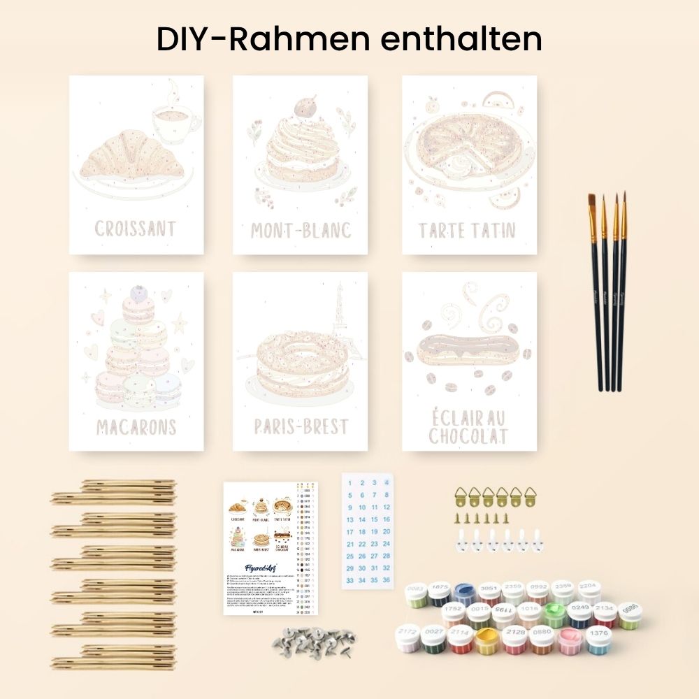 Mit dem Set Französische Backwaren aus der Süße Desserts Kollektion erhältst du sechs köstliche Malen nach Zahlen für Erwachsene-Modelle, inspiriert von der Welt der französischen Patisserie. Von feinen Törtchen und bunten Macarons bis hin zu eleganten Kuchen und süßen Leckereien, jede Kreation spiegelt Kunst, Charme und die Süße der französischen Backkunst wider. Perfekt, um deinem Zuhause eine fantasievolle Note zu verleihen oder als kreatives Geschenk für Naschkatzen.