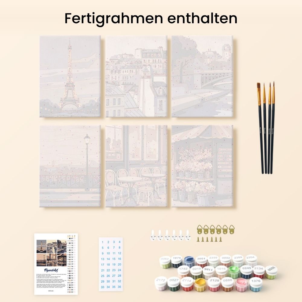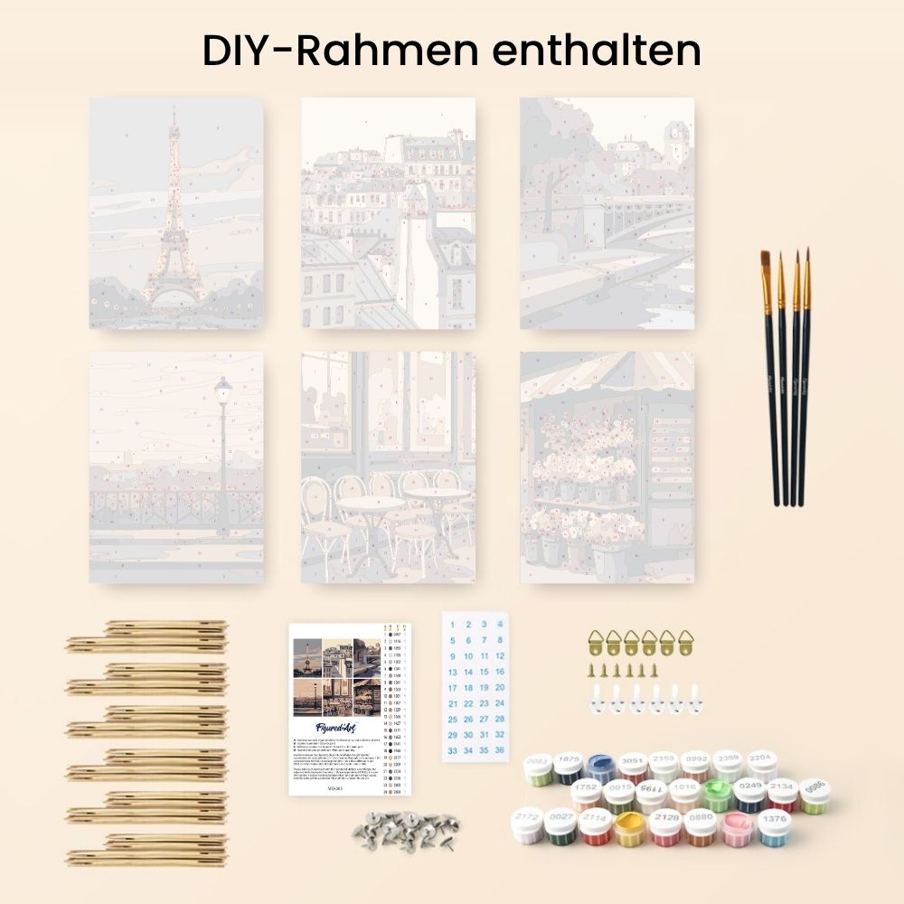 Das Set Pariser Charme enthält sechs Malen nach Zahlen Designs, die den romantischen Charme der französischen Hauptstadt einfangen. Der Eiffelturm, gemütliche Cafés und atemberaubende Aussichten über die Dächer der Stadt werden künstlerisch dargestellt. Ideal für Kunst- und Reisebegeisterte.
