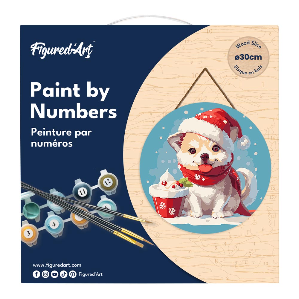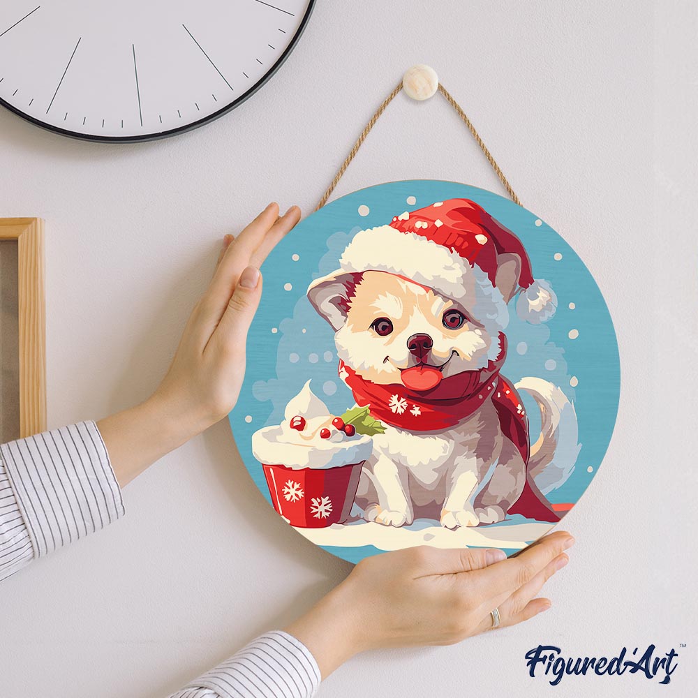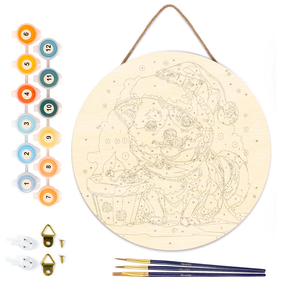 Malen nach Zahlen auf Holzscheibe - Weihnachtswelpe