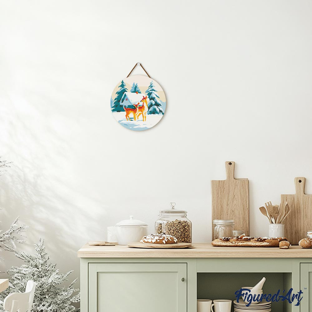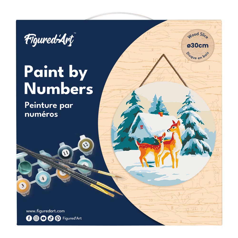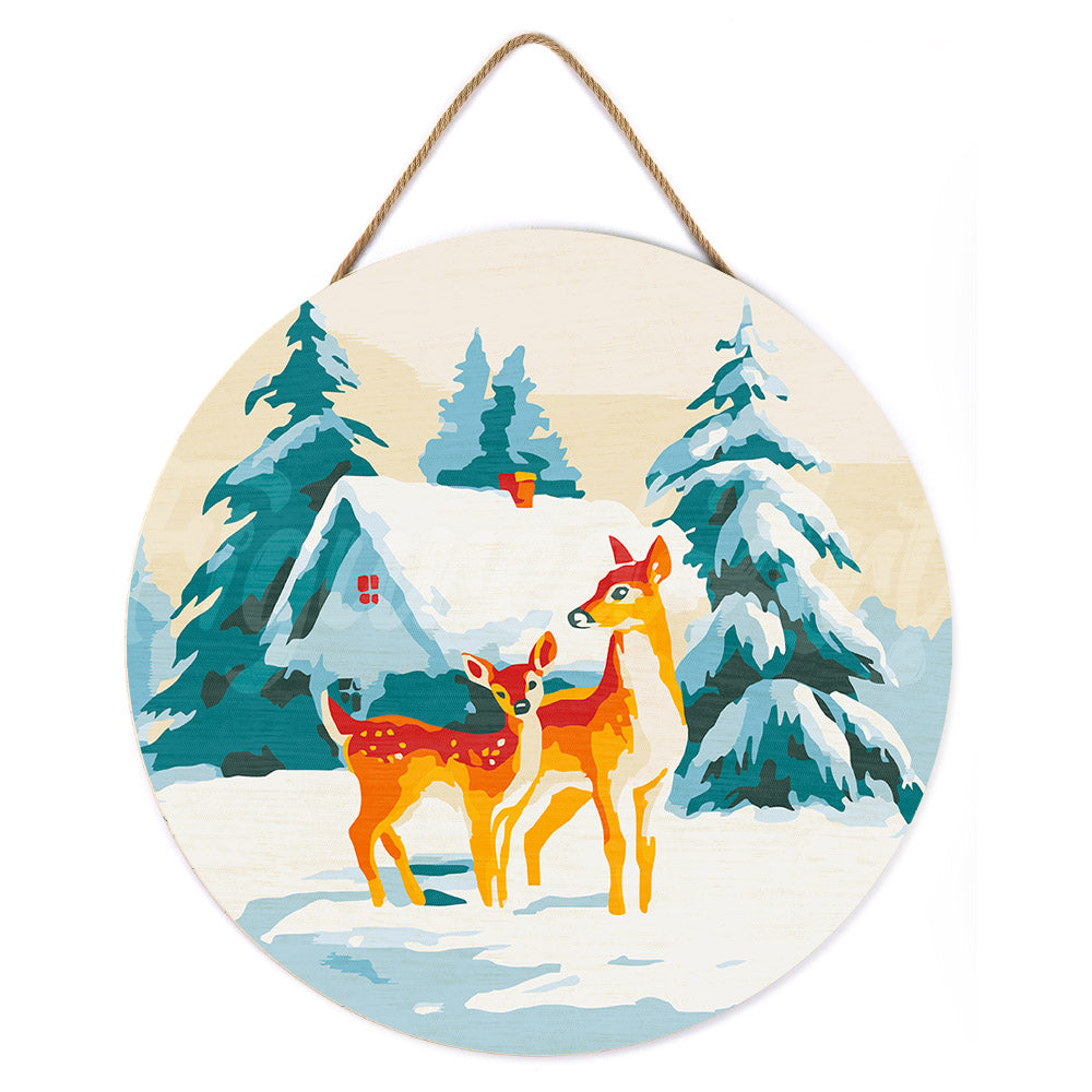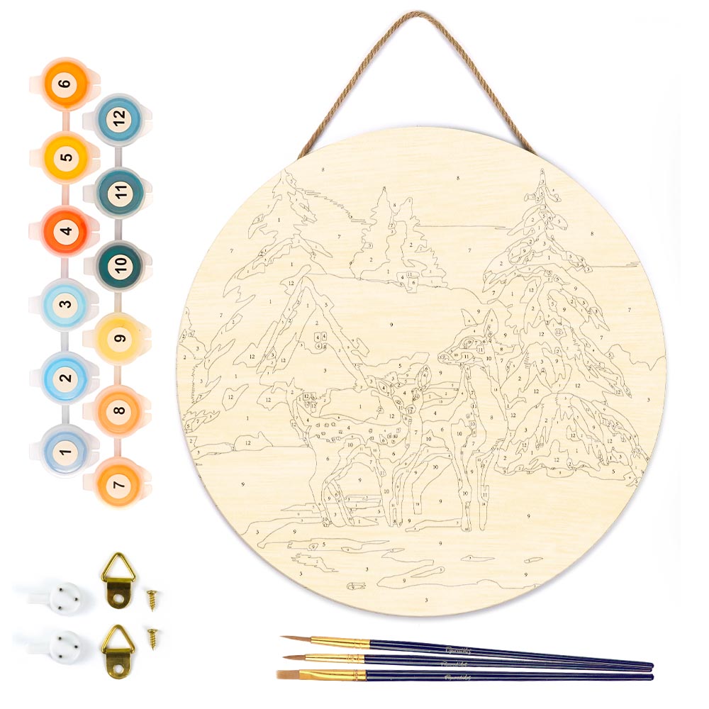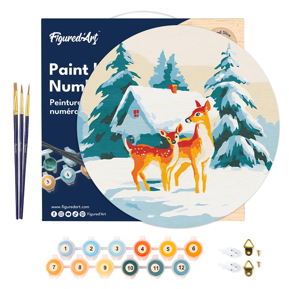 Malen nach Zahlen auf Holzscheibe - Hirsch und Hütte