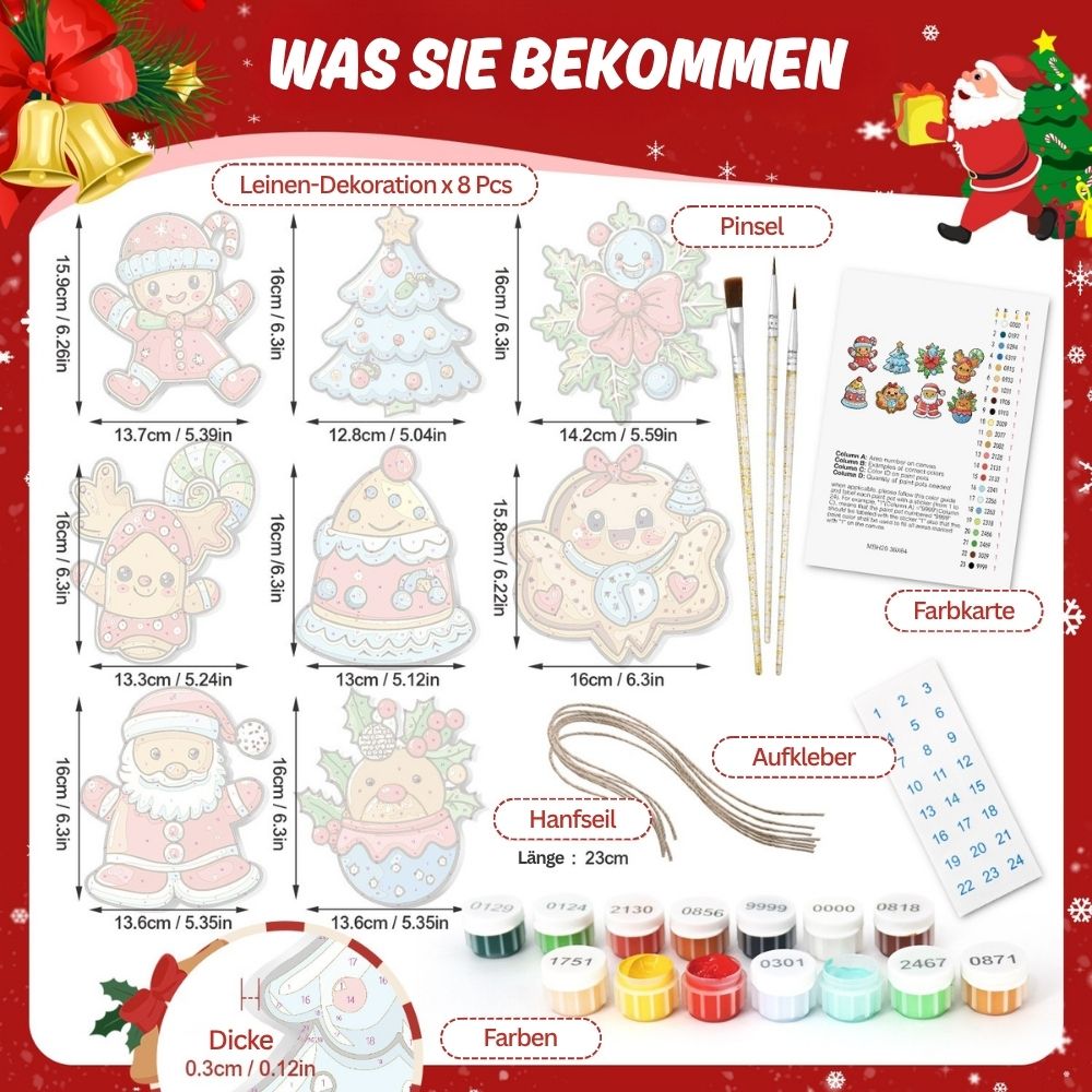 Umschließen Sie Ihre Feiertage mit Wärme und Kreativität mit dem Malen nach Zahlen Weihnachtsdekoration. Diese wunderschönen Ornamente verströmen die warme Atmosphäre eines Winternachmittags, erfüllt vom Duft von Plätzchen und Zimt. Jedes Holzstück ist in Form klassischer Weihnachtskugeln gestaltet: Lebkuchenmänner, Häuser, Sterne und vieles mehr, bereit, mit warmen Weihnachtsfarben bemalt zu werden. Eine kreative und unterhaltsame Art, Ihren Baum ganz persönlich zu schmücken. Jedes Stück fängt die Freude von Weihnachten und die Gemütlichkeit des Winters ein und ist eine besondere Ergänzung Ihrer Weihnachtsdekoration. Folgen Sie einfach den Nummern und erleben Sie, wie Ihre Ornamente mit Farbe und Charme zum Leben erwachen.
